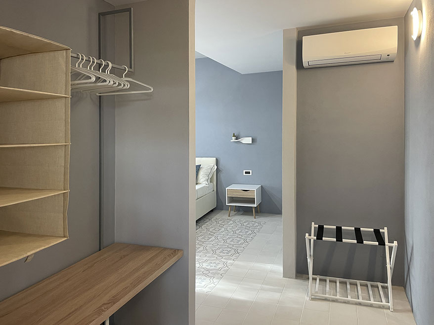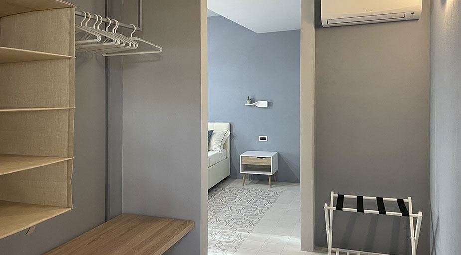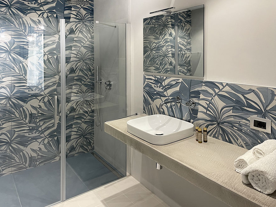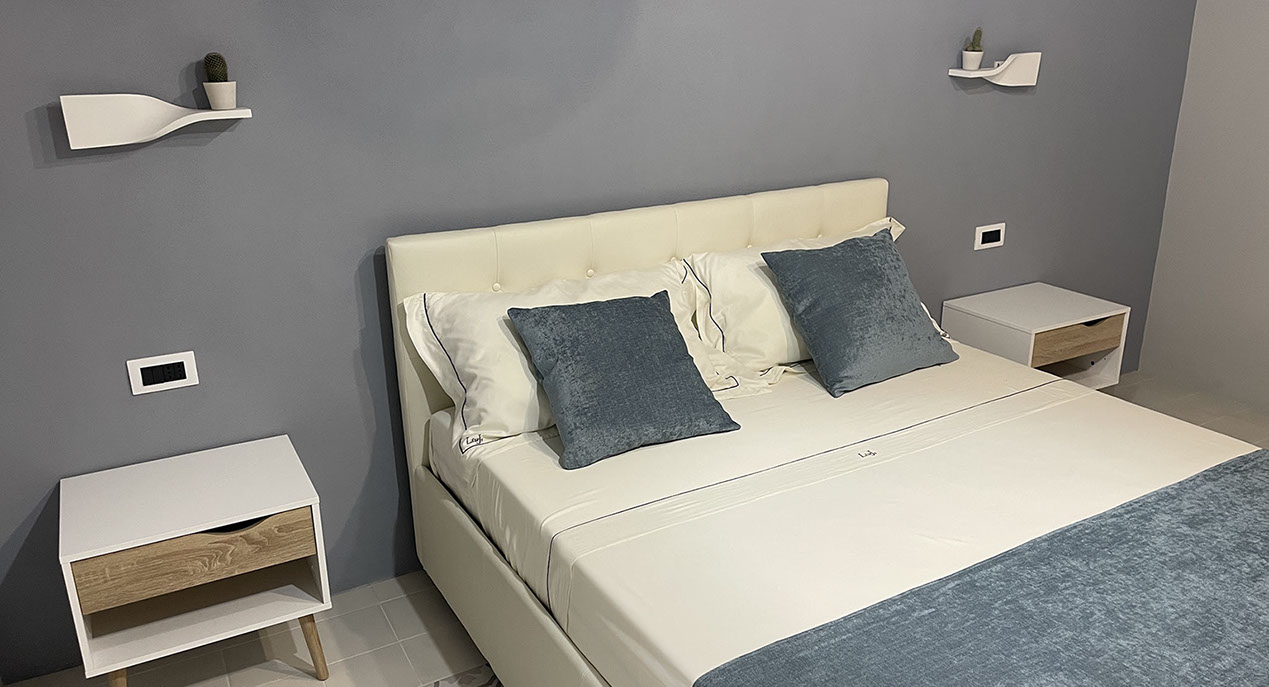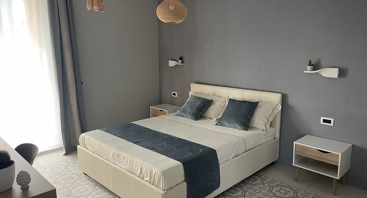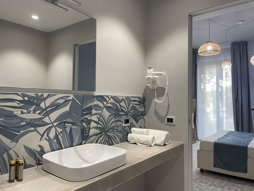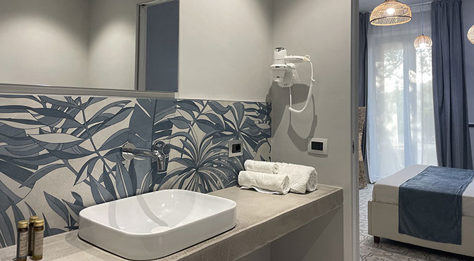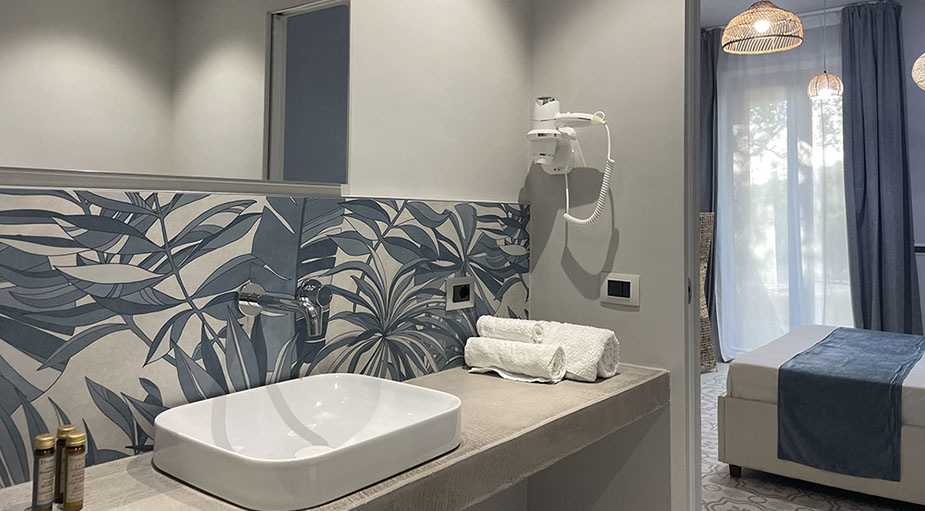 Ogni dettaglio è pensato per evocare la freschezza e la serenità del mare; le pareti sono decorate con tonalità di azzurro e sabbia, mentre gli arredi richiamano elementi marini, creando un'atmosfera accogliente e rilassante.