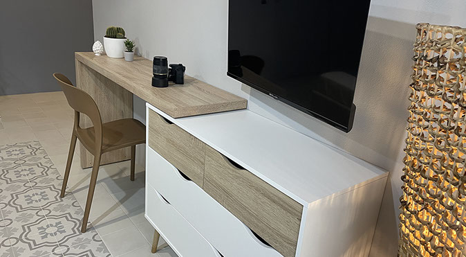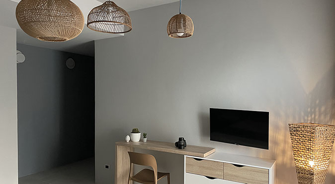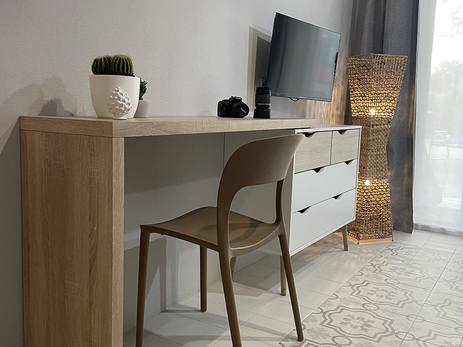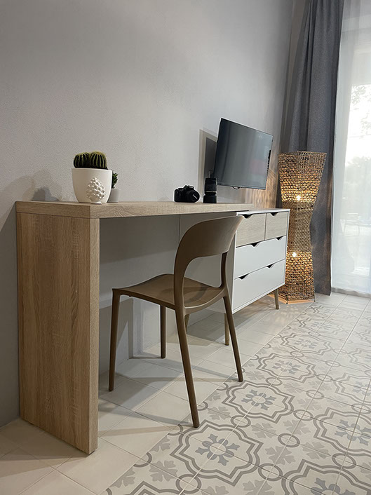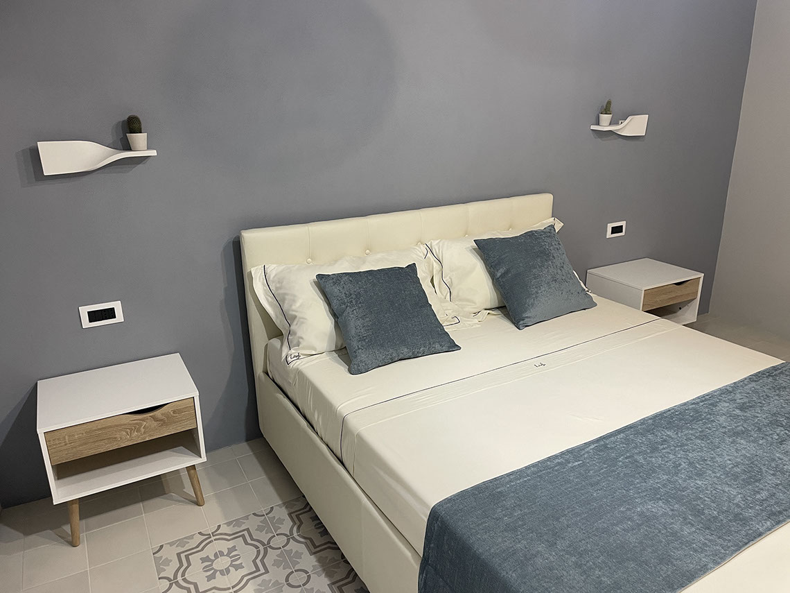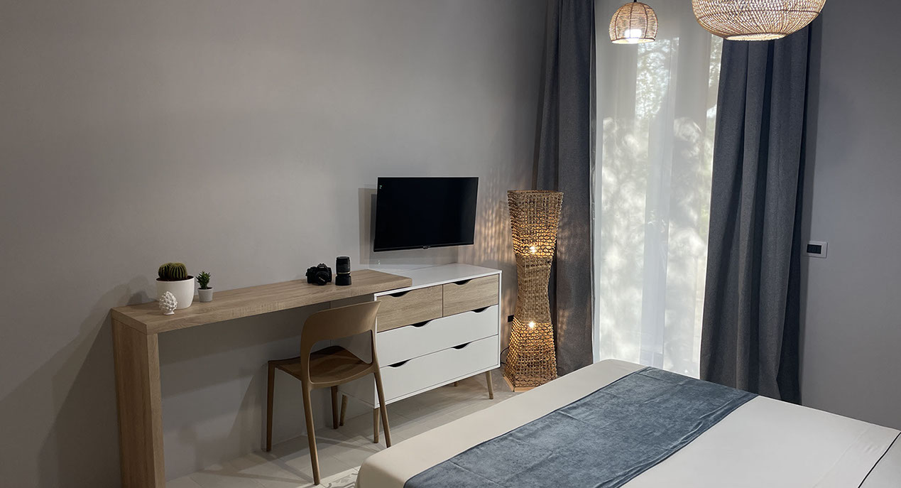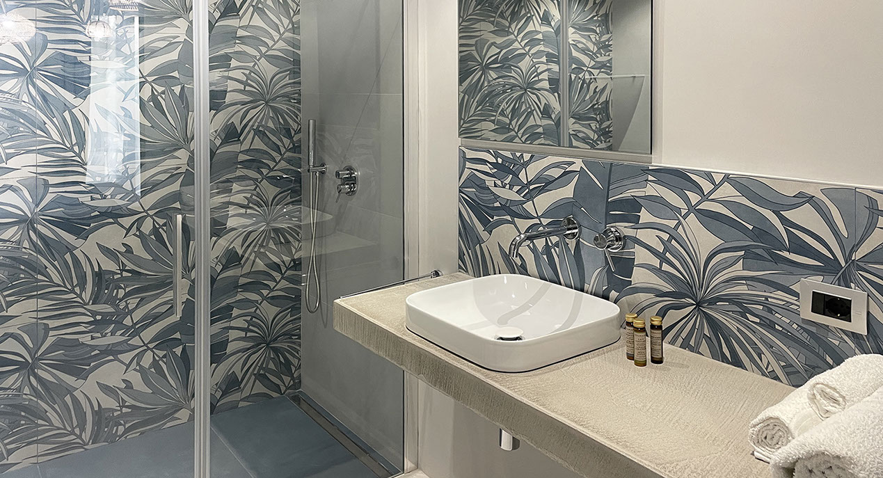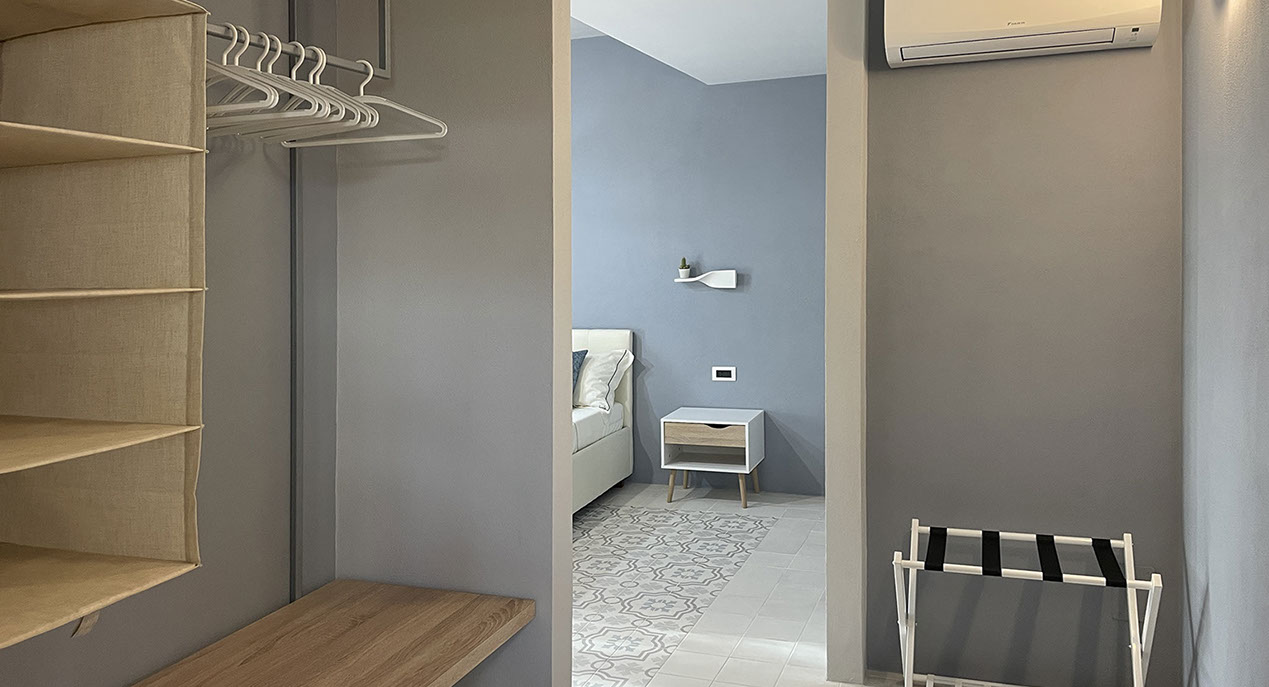 Ogni dettaglio è pensato per evocare la freschezza e la serenità del mare; le pareti sono decorate con tonalità di azzurro e sabbia, mentre gli arredi richiamano elementi marini, creando un'atmosfera accogliente e rilassante.