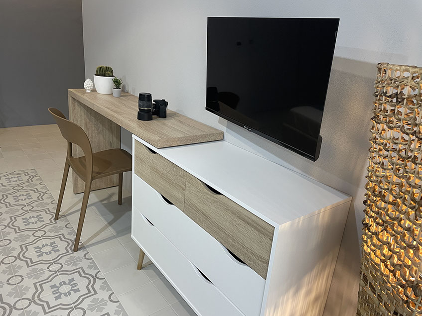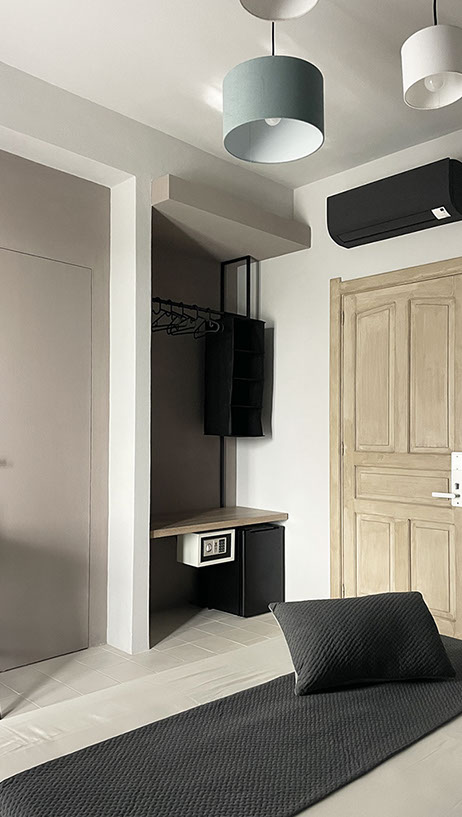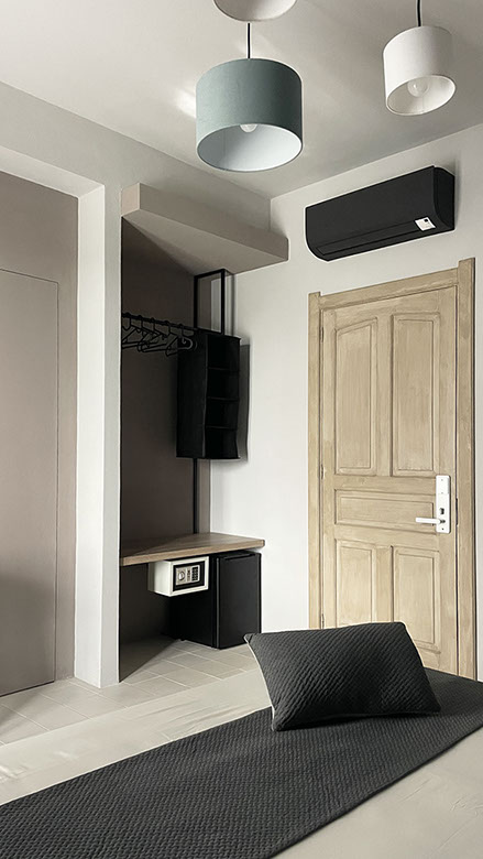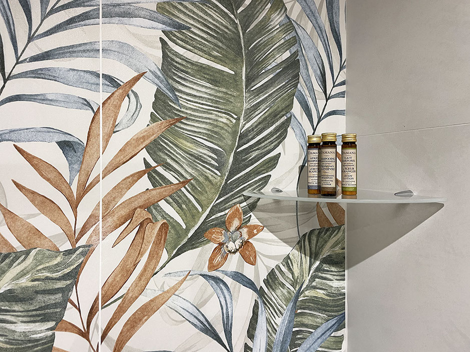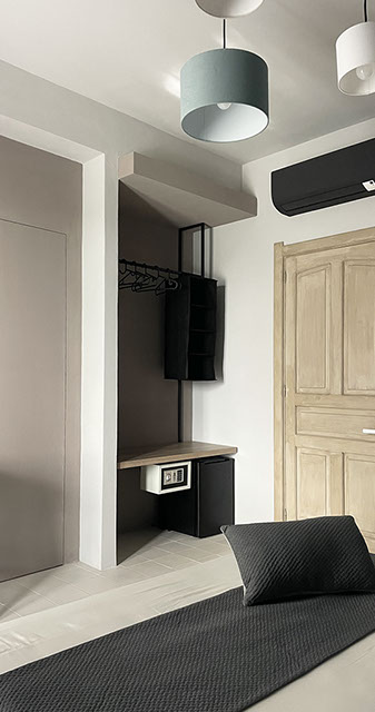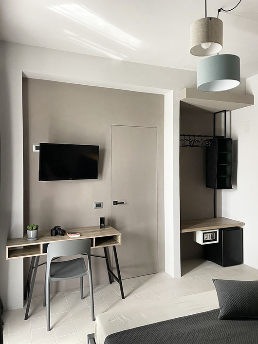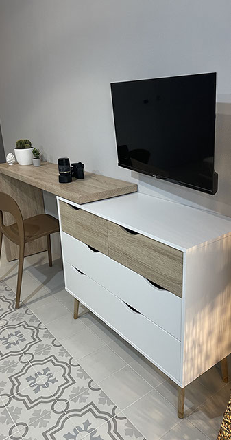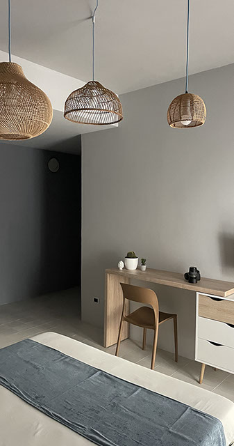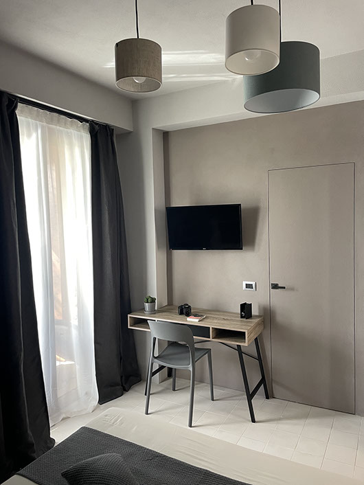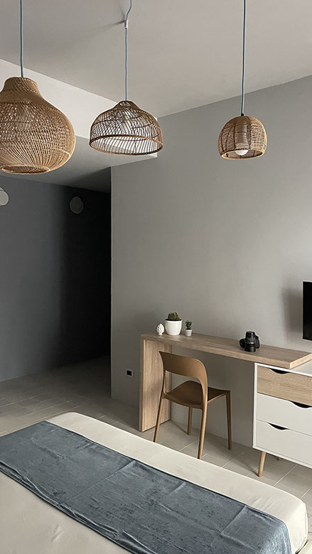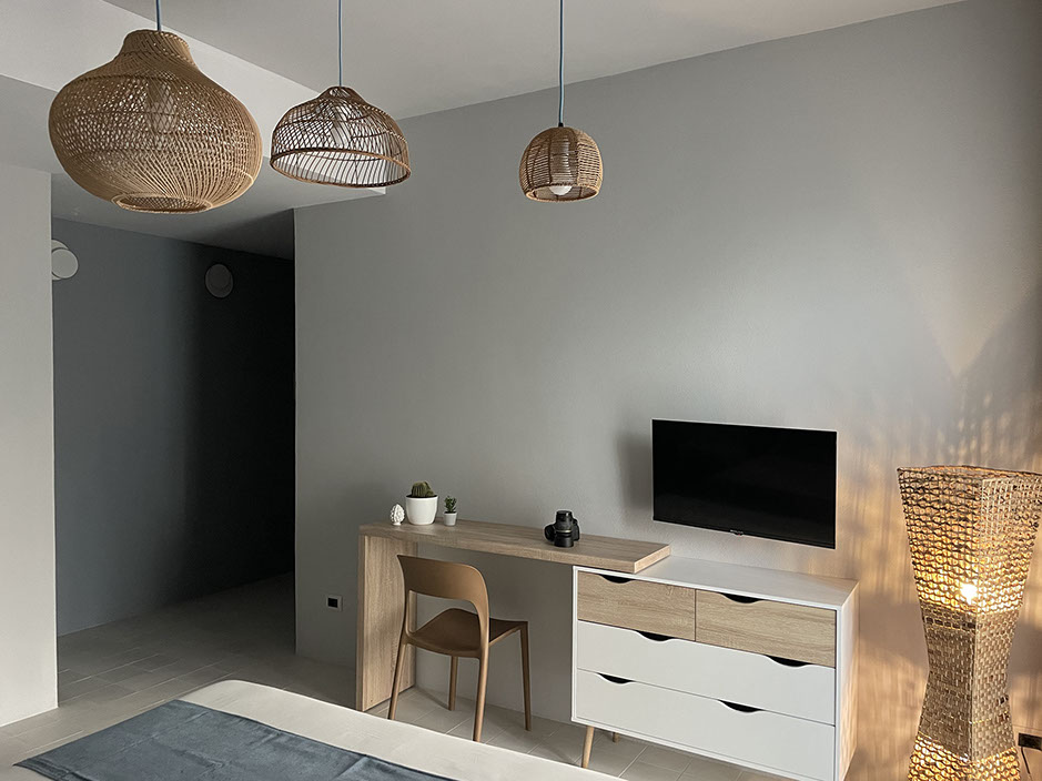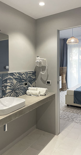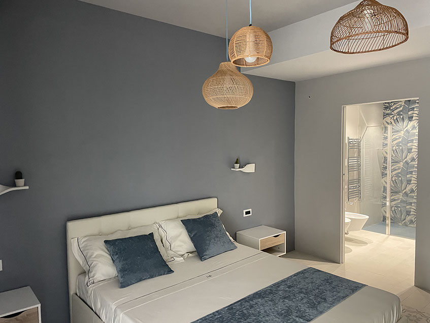 Ogni dettaglio è pensato per evocare la freschezza e la serenità del mare; le pareti sono decorate con tonalità di azzurro e sabbia, mentre gli arredi richiamano elementi marini, creando un'atmosfera accogliente e rilassante.