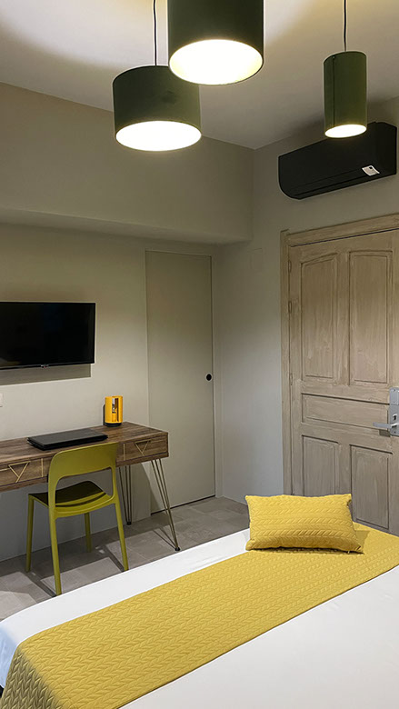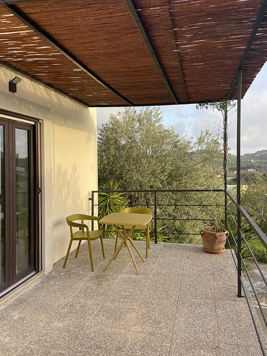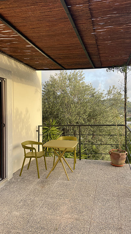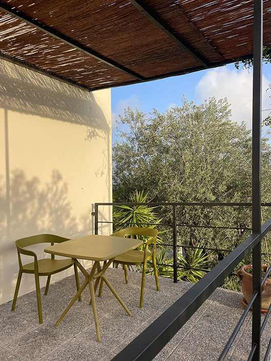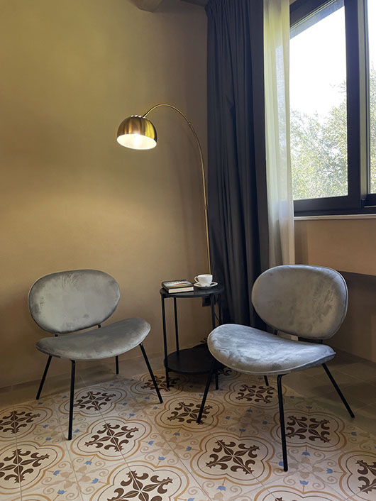Questa grande superficie vetrata apribile permette alla luce naturale di inondare lo spazio interno così che l'esclusivo angolo salotto costituito da un tavolino e due poltroncine, set non in dotazione delle altre camere, possa offrire la possibilità di rilassarsi leggendo un bel libro, ascoltando della buona musica, gustando qualcosa di buono, o semplicemente mirando all'esterno, la natura che circonda la dimora delle Naiadi di Noto. Anche questa camera è dotata di un bagno completo di esclusiva pertienza, con ampio box doccia e ogni comfort.