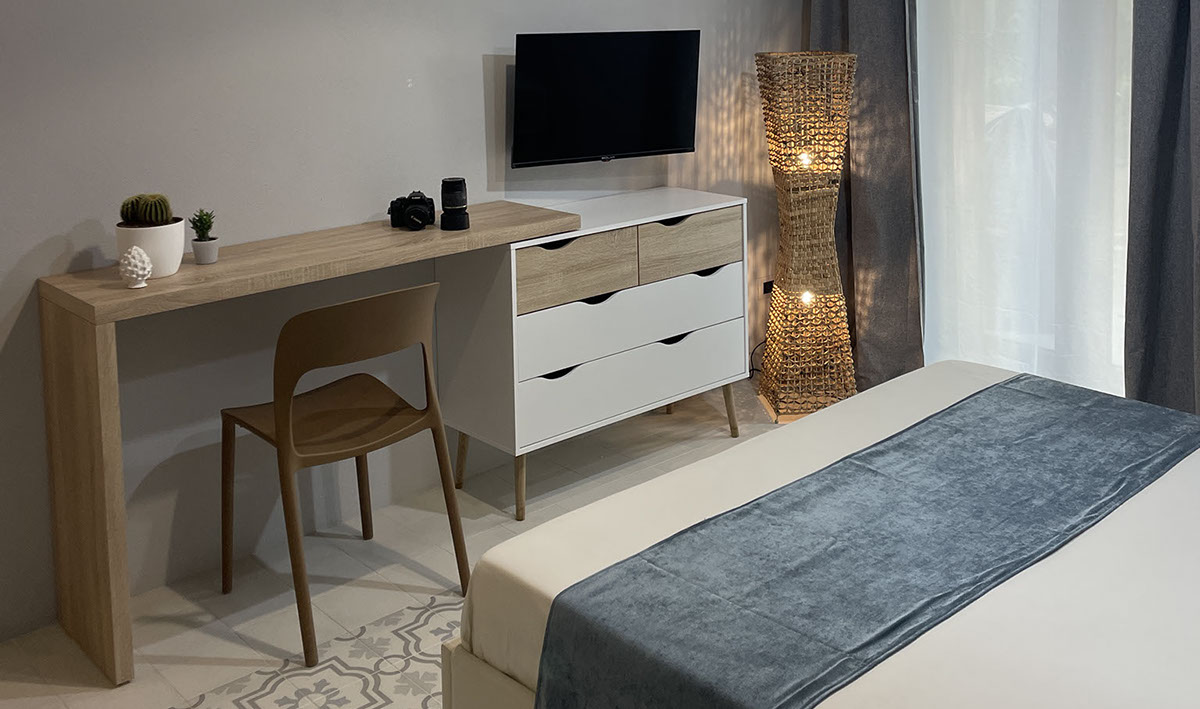 The rooms of la dimora delle Naiadi di Noto | Sicilia For Homer defined as "daughters of Zeus", the Naiads are nymphs of Greek mythology who preside over all the fresh waters of the earth and were often associated with the explanation of particular phenomena from which myths and legends arose that see them endowed with healing powers thanks to which the sick who drank the water from their sources could benefit from it. From here the cult of the Naiads had great success and diffusion especially among the poorer classes and among the farmers who, to ingratiate themselves with them, offered flowers, fruit and milk. Recalling this belief of Hellenic mythology and looking at the beneficial effects on man given by these nymphs, our b&b dedicates its rooms to the Naiads to offer its guests a corner of tranquility and comfort for an unforgettable stay that meets the expectations of the most demanding customers who in this part of eastern Sicily, can find a small corner of relaxation and leisure, as well as a hospitality structure near some of the most beautiful and sought-after tourist destinations among which the City of Noto is undoubtedly the protagonist, defined as "the Capital of Baroque". Each room is tastefully furnished, combining elements of modern design and touches of warmth typical of Sicilian tradition.