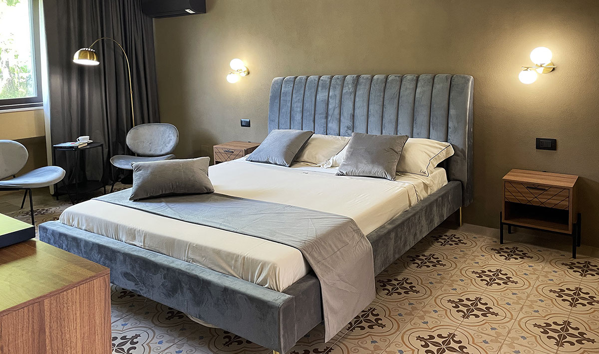 Ciane The rooms of la dimora delle Naiadi di Noto This beautiful double bedroom is located on the first floor of the Naiadi di Noto residence, and is equipped with a large sliding window that overlooks a lush and green pine forest, and also allows a view of the swimming pool. This large opening glass surface allows natural light to flood the interior space so that the exclusive living area consisting of a coffee table and two armchairs, a set not provided in the other rooms, can offer the possibility of relaxing by reading a good book, listening to good music, enjoying something good, or simply looking outside, at the nature that surrounds la dimora delle Naiadi di Noto. This room also has a complete bathroom of exclusive relevance, with a large shower and every comfort.